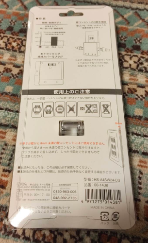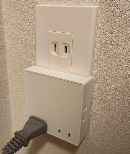 壁のコンセントの下側に挿すことで、1口のコンセントが4口にまで増えるという優れもの。
